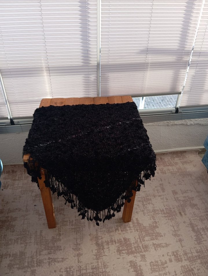 Siyah örgü kadın şal, püsküllü detayları ve rahat dokusuyla bohem ve retro tarzlara uygundur. Sıcak tutar, gotik hava katar. el emeğidir hiç kullanılmadı