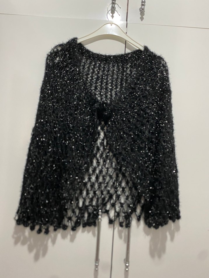 Kızlar için siyah renkli, uzun kollu, straplez yakalı, gevşek kesim örgü bolero. Goth tarzına uygun, desensiz ve açık örgü dokusuna sahip. Temiz hiç kullanılmamıştır çeyizlik