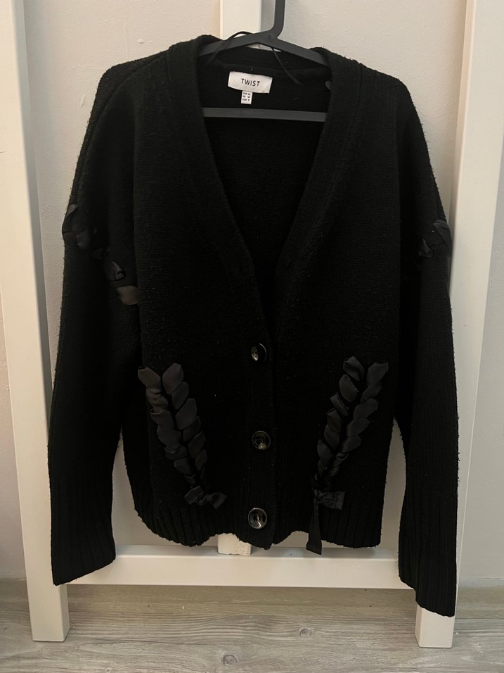 Siyah örgü, uzun kollu, düğmeli kadın hırka. Klasik yaka ve bol kesimiyle günlük kullanıma uygun, rahat ve gotik tarzda.