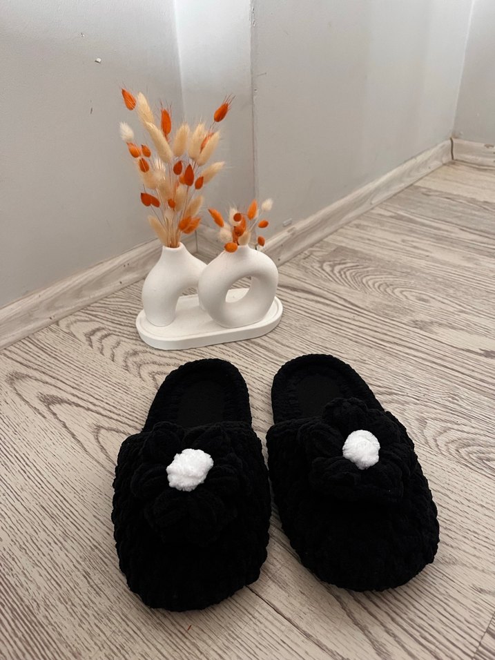 Kadınlar için örgü dokulu, platform topuklu siyah ev terliği. Koyu çiçek desenli, bohem tarzda ve günlük kullanıma uygun.