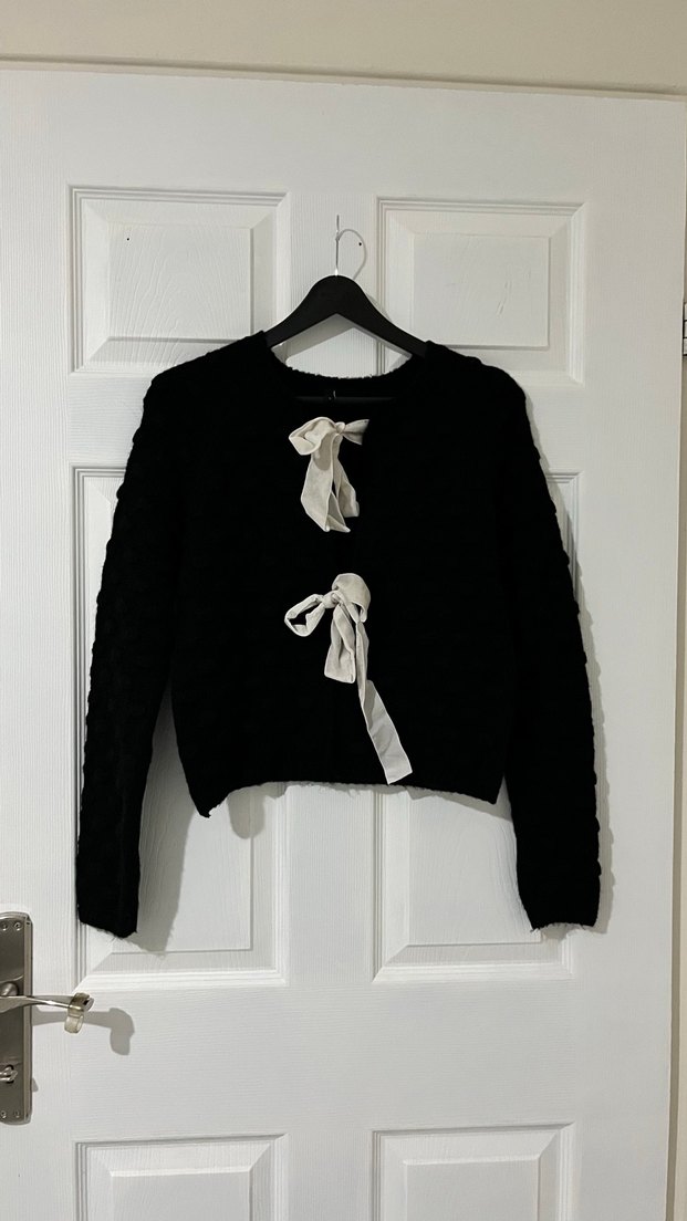 Siyah renkli, uzun kollu örgü kadın kazak, halter yaka ve önünde iki dekoratif fiyonk ile. Salaş kesim ve midi boyda, günlük kullanıma uygun gotik tarzda.