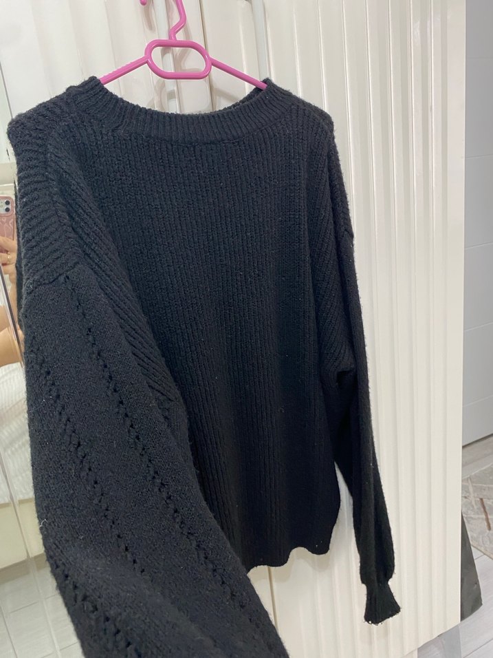 Örgü kumaştan yapılmış, salaş kesimli, yuvarlak yakalı siyah kadın kazak. Uzun kollu ve normal midi boyda, günlük rahat stil için uygundur.