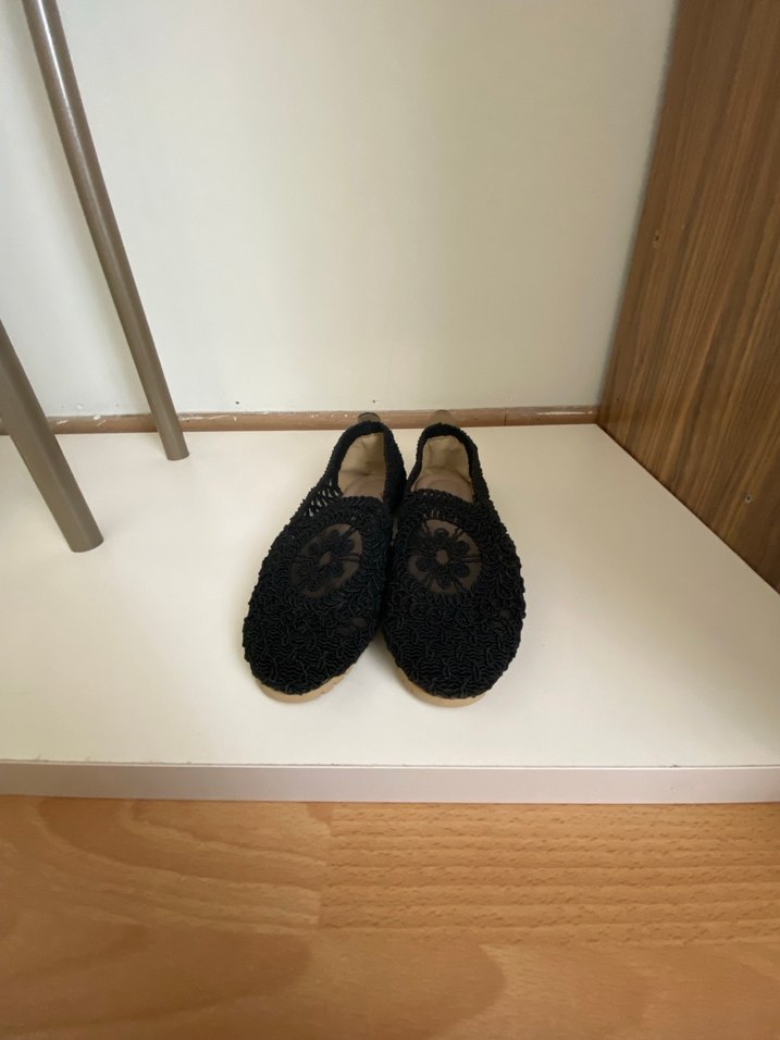 Kadınlar için siyah örgü espadril, düz tabanlı ve minimalist tasarımlı. Rahat ve günlük kullanım için bohem tarzda.