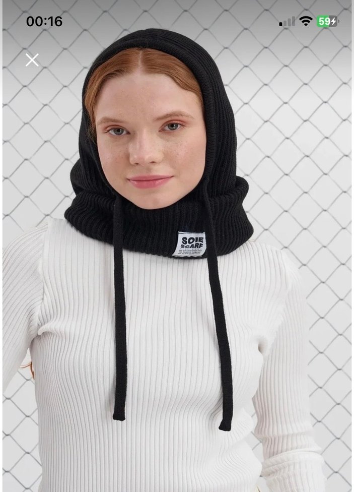 Siyah örgüden yapılmış, rahat ve sokak stiliyle uyumlu kadın bere. 'SOIE SCARF' etiketine sahiptir.