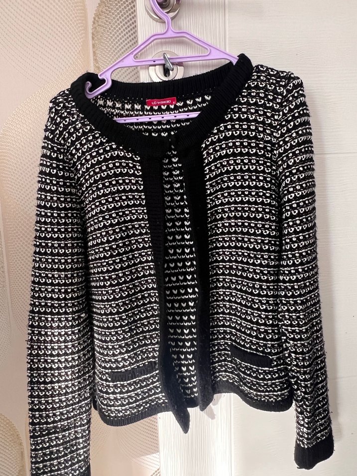 Kadınlar için siyah-beyaz desenli, örgü triko hırka. Uzun kollu, fitted kesim ve yakasında notched lapel detay bulunur. Günlük kullanıma uygundur.