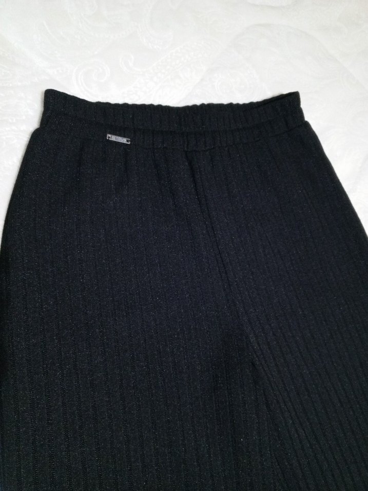 Siyah piliseli, normal boy midi kumaş pantolon, elastik bel bandı ve yumuşak sentetik kumaştan üretilmiştir.