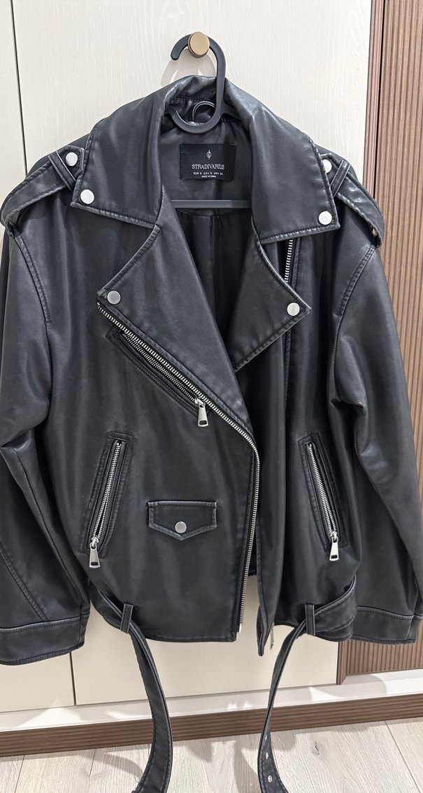 Siyah deri biker ceket, bol kesim ve askılı kollarla, toka detayları ve kesik yaka ile grunge punk tarzını yansıtıyor. Günlük kullanım için uygun.
