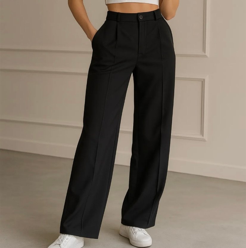 Siyah, palazzo pantolon sentetik kumaştan üretilmiş, ofis ve sokak stiline uygun rahat ve şık bir model.