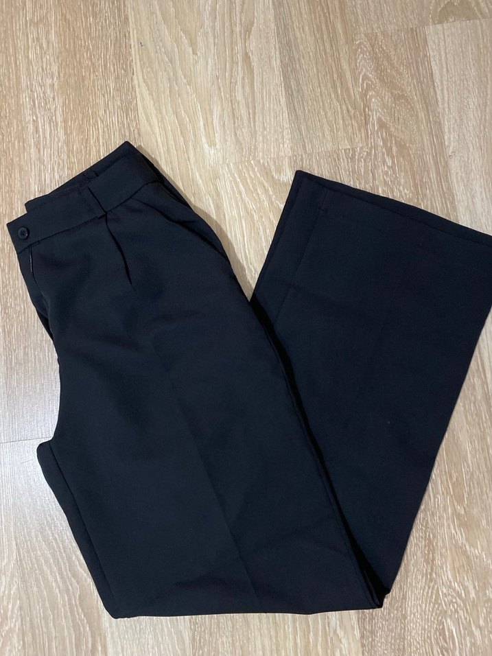 Kadınlar için siyah kumaş pantolon, normal kalıp ve midi boyda. Sentetik kumaştan yapılmış, ofis kullanımı için uygun, desen içermeyen sade bir tasarıma sahip.
