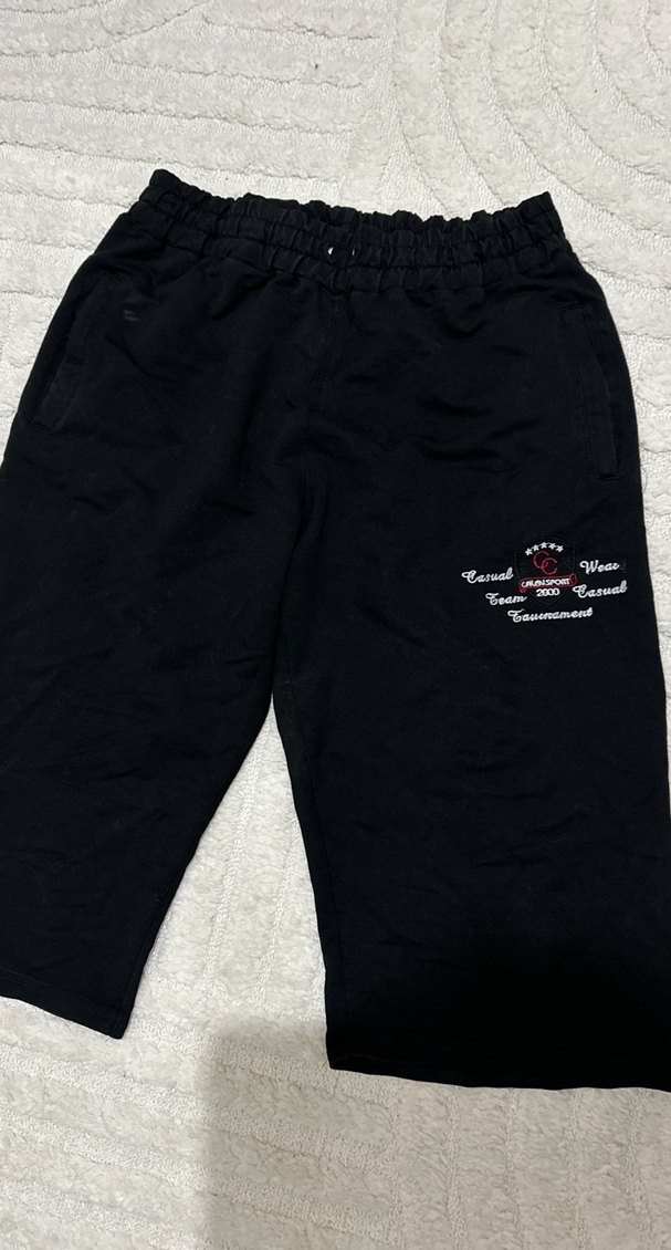 Siyah pamuklu midi eşofman altı, bol kesim ve lastikli bel ile. İnce nakış detaylı, spor ve günlük rahat kullanıma uygun.