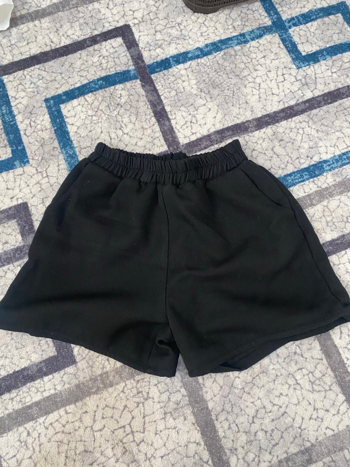 Siyah pamuklu mini şort, bol kesim ve lastikli bel bandı ile rahat bir kullanım sunar. Günlük ve sokak tarzı için uygundur.