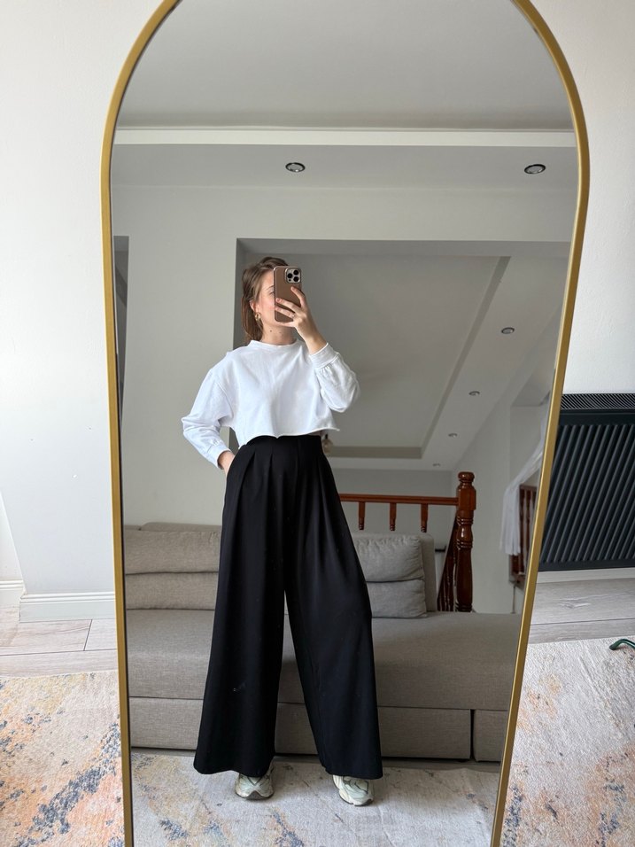 Kadınlar için pamuklu, rahat kesim ve midi boy siyah pantolon. Minimalist ve desen içermeyen tasarımıyla günlük kullanıma uygun, zahmetsiz şıklık sunar.