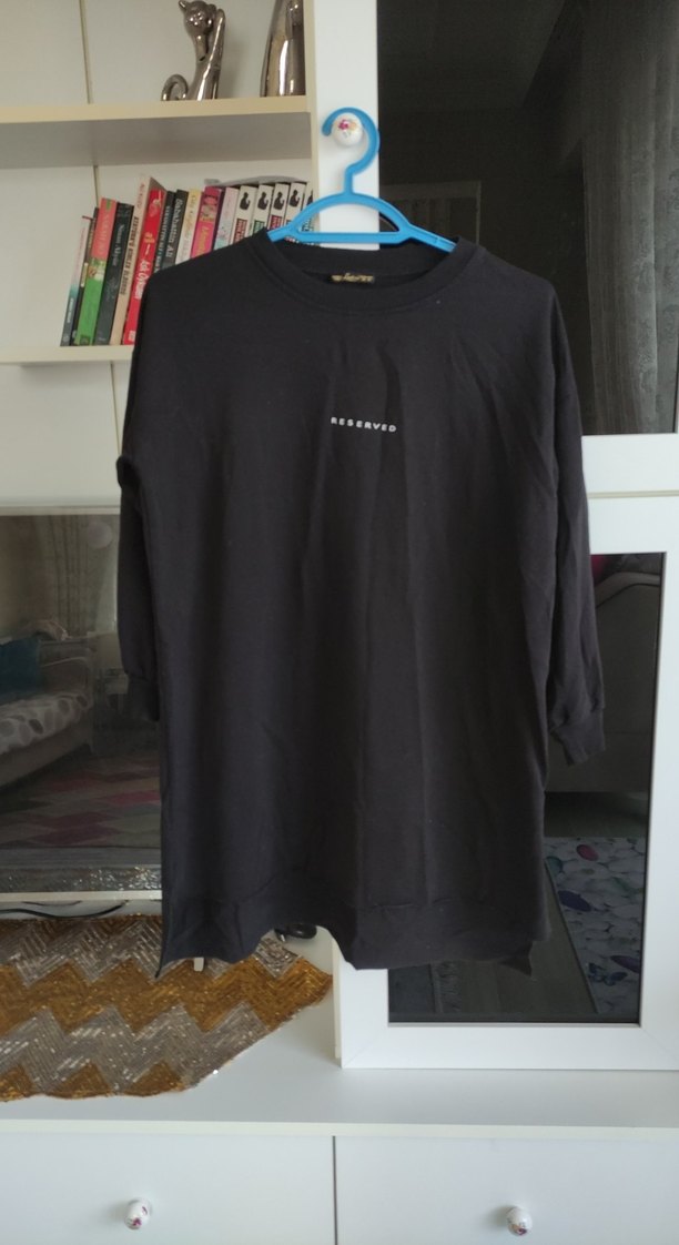 Siyah pamuklu, uzun kollu, yuvarlak yakalı ve bol kesim kadın tişörtü. Minimalist, desensiz ve rahat günlük sokak stili için uygundur. yarım koldur hiçbir sorunu yoktur az kullanilmistir m.l . uyumludur