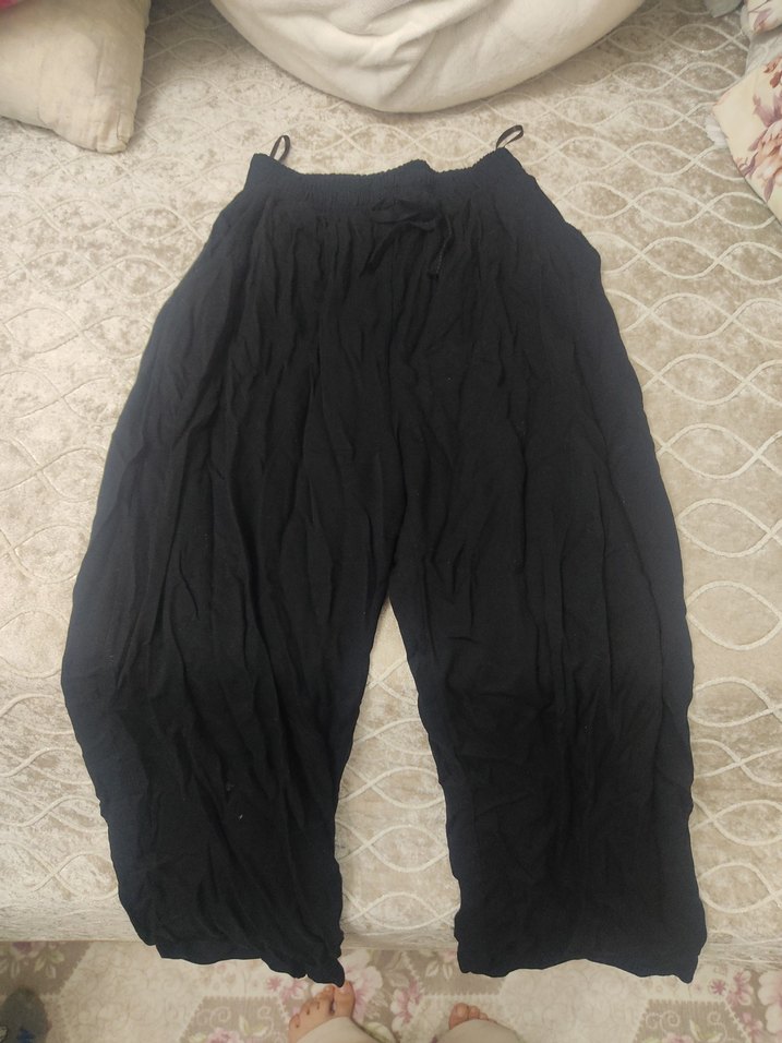 Salaş kesim, siyah keten pantolon, drapeli detaylı, , günlük rahat kullanım için uygun. yazlık aşırı derin bı pantolon bende 2 tane olduğu için satıyorum fiyatı Uygun tuttum