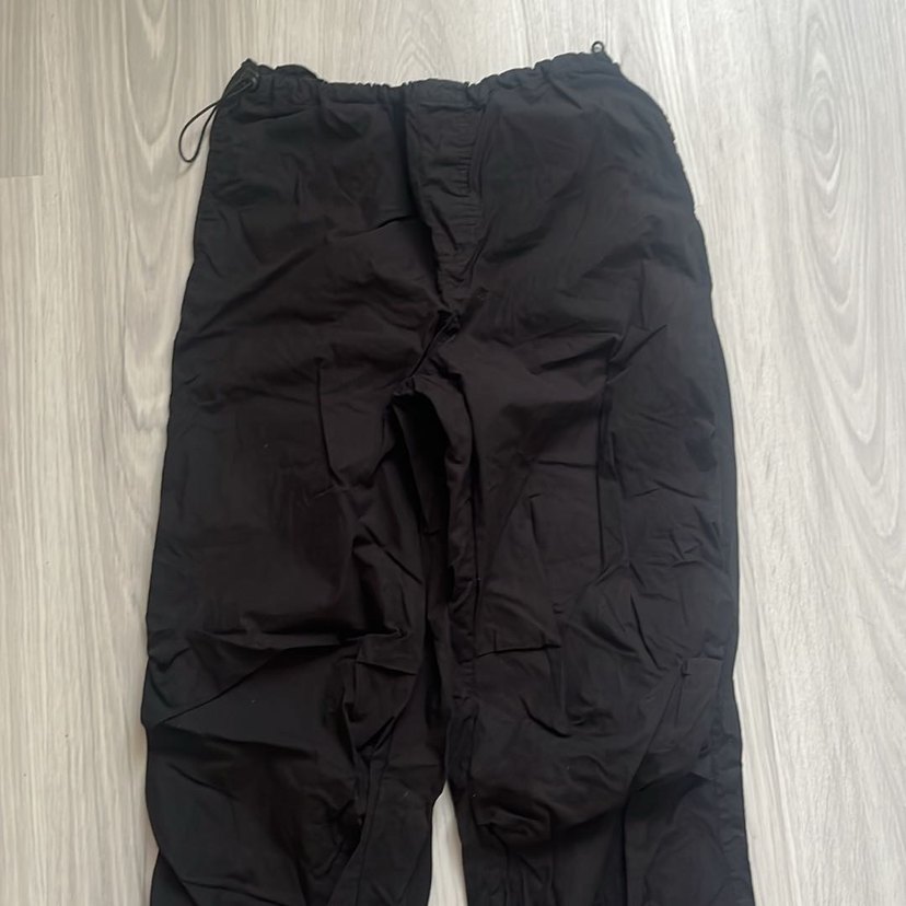 Siyah paraşüt , bol kesim ve midi boyda, fermuarlı, minimalist tarzda dış mekan kullanımı için uygun kadın pantolonu.