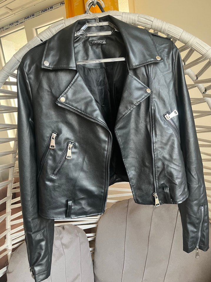 Parlak siyah deri biker ceket, oturan kesim, kesik yakalı ve kayışlı kollu. Tokalı detaylar ve fermuarlı ceplerle trendy casual tarzı için uygun.