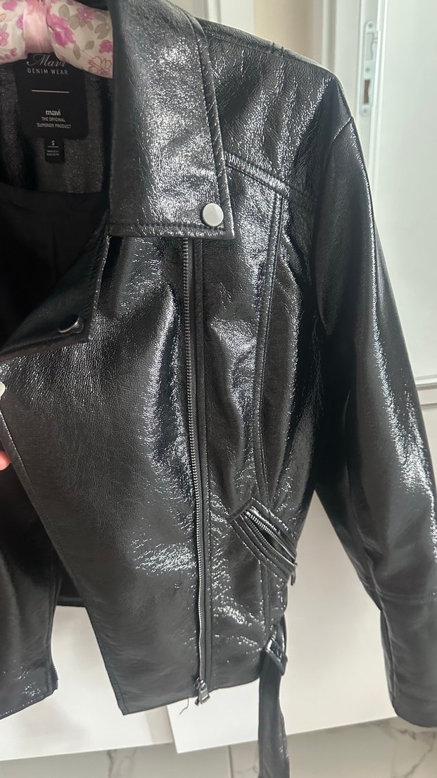 Kadın siyah parlak deri biker ceket, fitted kesim, tokalı detaylar, yaka kısmı notched lapel ve askılı kollara sahiptir. Romantik gece için uygundur.