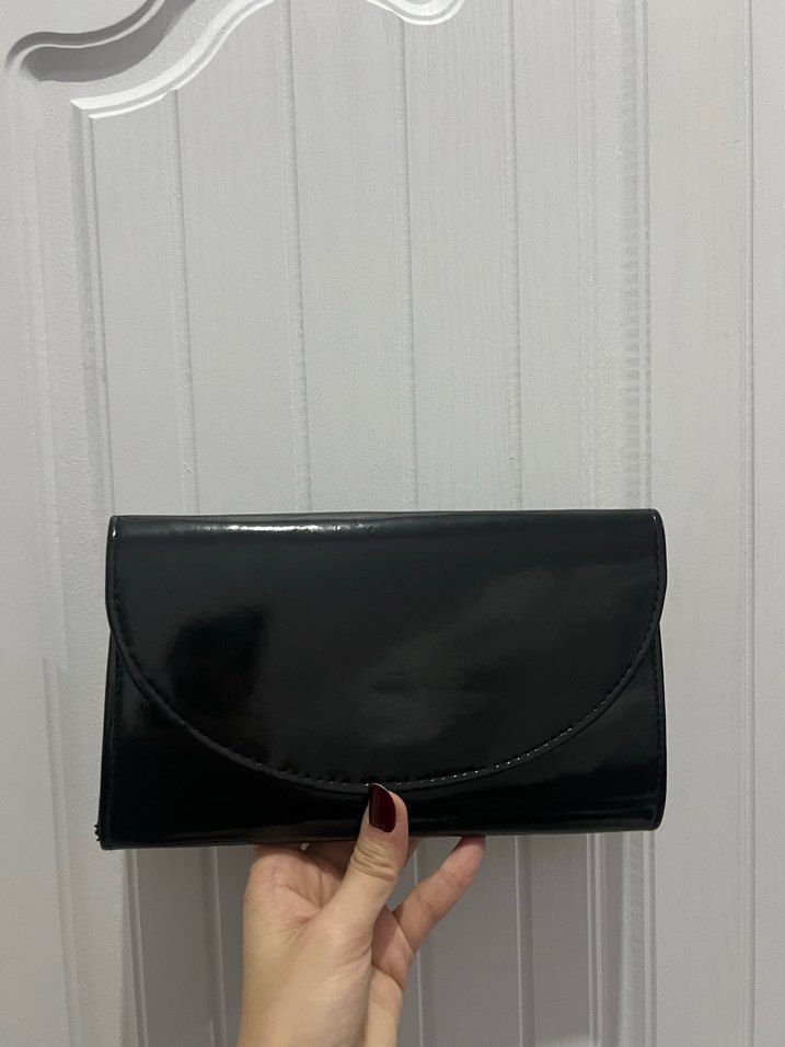 Parlak siyah deri clutch çanta, minimalist ve gotik tarzda, günlük kullanım için klasik şıklık sunar. Desensiz ve sade tasarımıyla dikkat çeker.