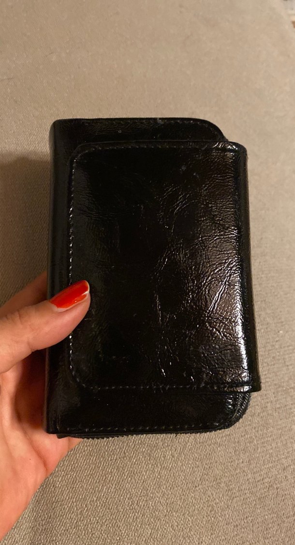Kadınlar için parlak siyah deri cüzdan. Düz ve desensiz yüzeye sahip, gotik stile uygun, günlük kullanıma elverişli.