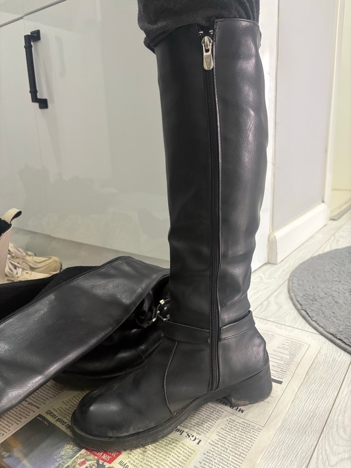 38 Numara. Kadınlar için dizüstü, parlak siyah deri biker çizme, şık stiletto topuk ve tokalı detaylarla trendy bir görünüm sunar.