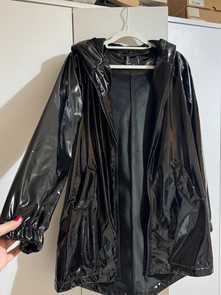 Siyah parlak deri, uzun kollu, notalı yaka detaylı, bol kesim midi yağmurluk. Gotik ve avangard tarzda, günlük kullanım için uygun. İçi polarlı