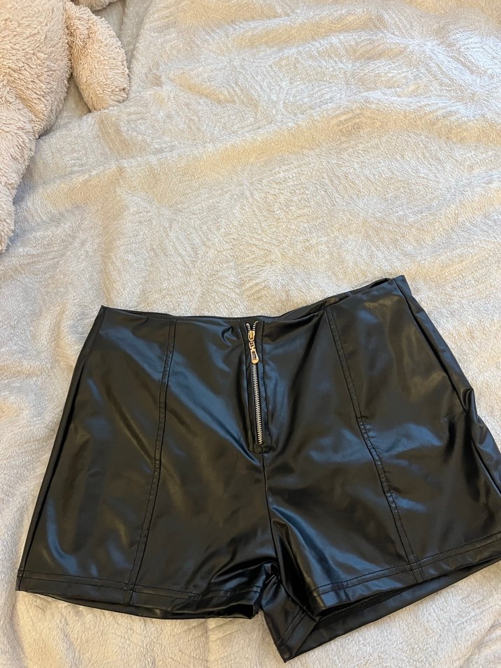 Önü fermuarlı, siyah parlak deri mini şort. Cesur sokak modası ve dış mekan spor giyimi için uygun.