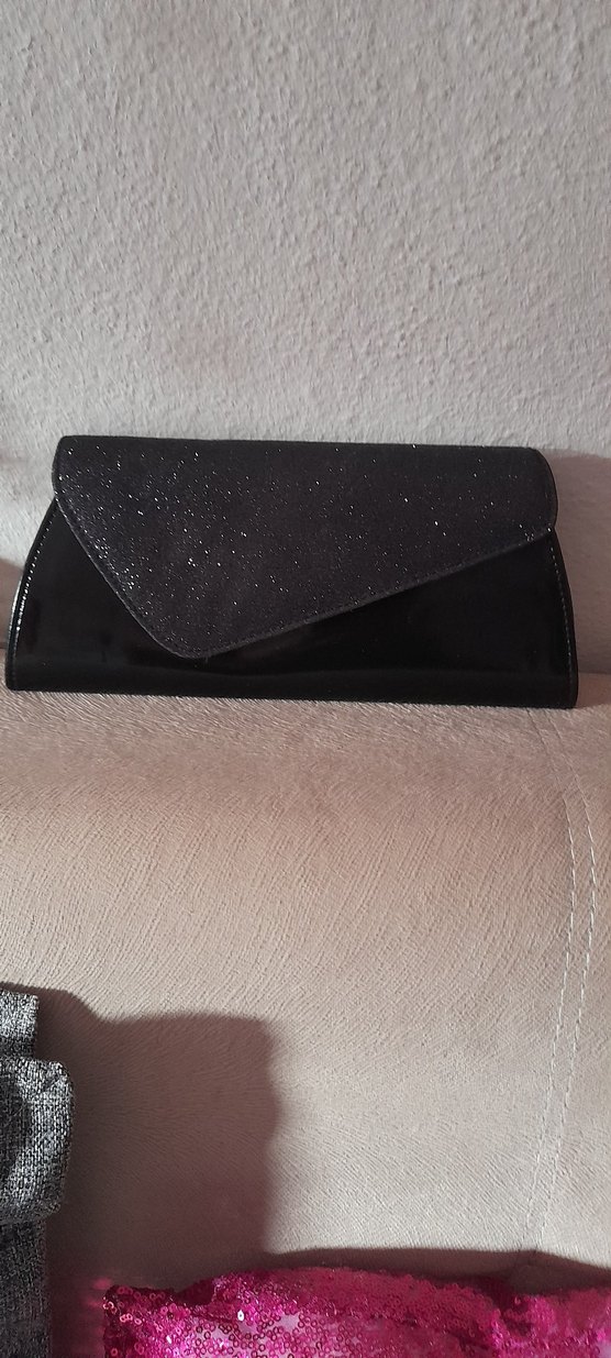 Kadınlar için parlak siyah deri portföy çanta, desensiz ve çağdaş tasarıma sahip. Romantik akşamlar için klasik şıklık sunar.