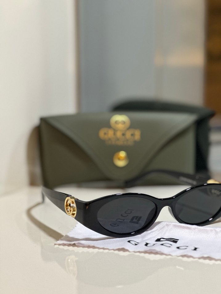 Kadınlar için siyah parlak Gucci güneş gözlüğü, klasik zarafetle sokak modasını birleştirir, koyu çerçeve ve altın detaylara sahiptir. ️