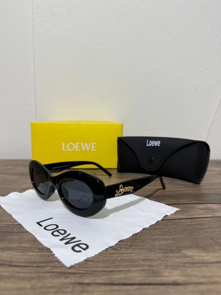 Klasik sokak stiliyle siyah parlak Loewe güneş gözlüğü, yuvarlak çerçeve ve markalı kılıf ile trendy casual kadın gözlüğü.Set gönderimi