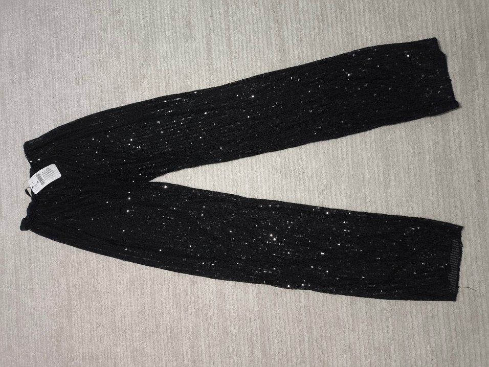 Kadınlar için siyah sentetik kumaştan yapılmış, parlak detaylı ve pullu pantolon modern ve rahat bir görünüm sunar. ✨