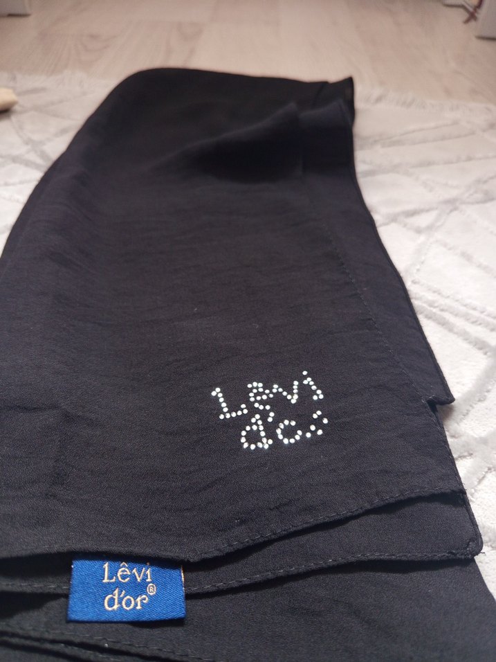 Kadın siyah saten şal, parlak payet detaylı ve minimalist tarzda, sokak modasına uygun. Levi d'ore etiketiyle şıklık katıyor.