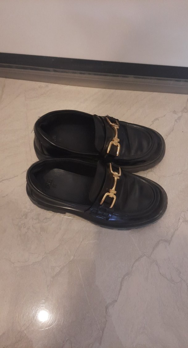 Kadınlar için siyah, parlak görünümlü, altın tokalı ve kalın topuklu, kauçuk malzemeden loafer ayakkabılar. Günlük kullanıma uygundur.