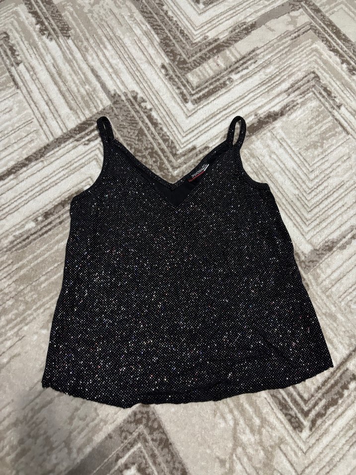 Siyah, parıltılı, v yaka, kısa ve dar kesim kadın atlet. Sentetik kumaştan yapılmıştır ve parti için uygundur. ✨