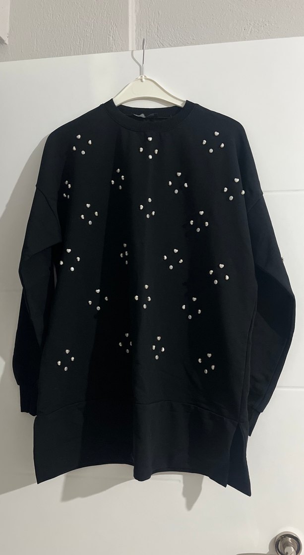 Siyah, uzun kollu, yuvarlak yaka, bol kesim, payet işlemeli sweatshirt. Yumuşak ve sıcak kumaştan, rahat kullanım için uygundur. ✨
