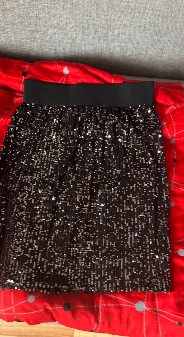 Siyah payetli, elastik bel bantlı, parti ve sokak stili için uygun, dar kesim midi etek. ✨
