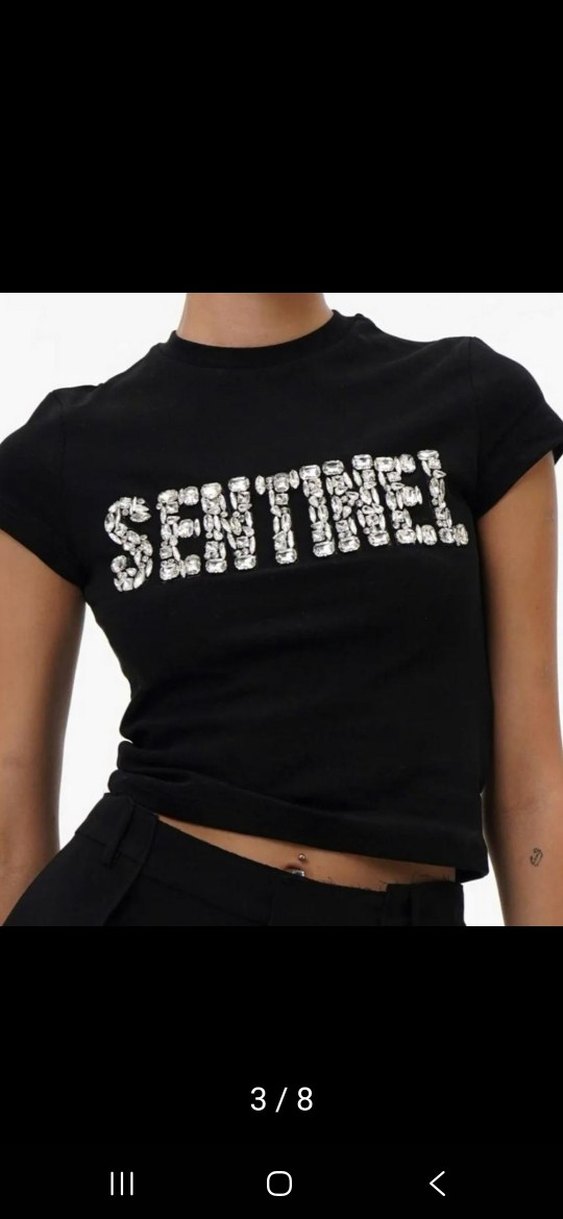 Siyah, kısa kollu, payet işlemeli ve baskılı "SENTINEL" yazılı, mini kesim, sentetik kumaştan kadın tişörtü. Sokak stili ve günlük kullanıma uygun. ✨sıfır etiketli ürün.dar kalıp.