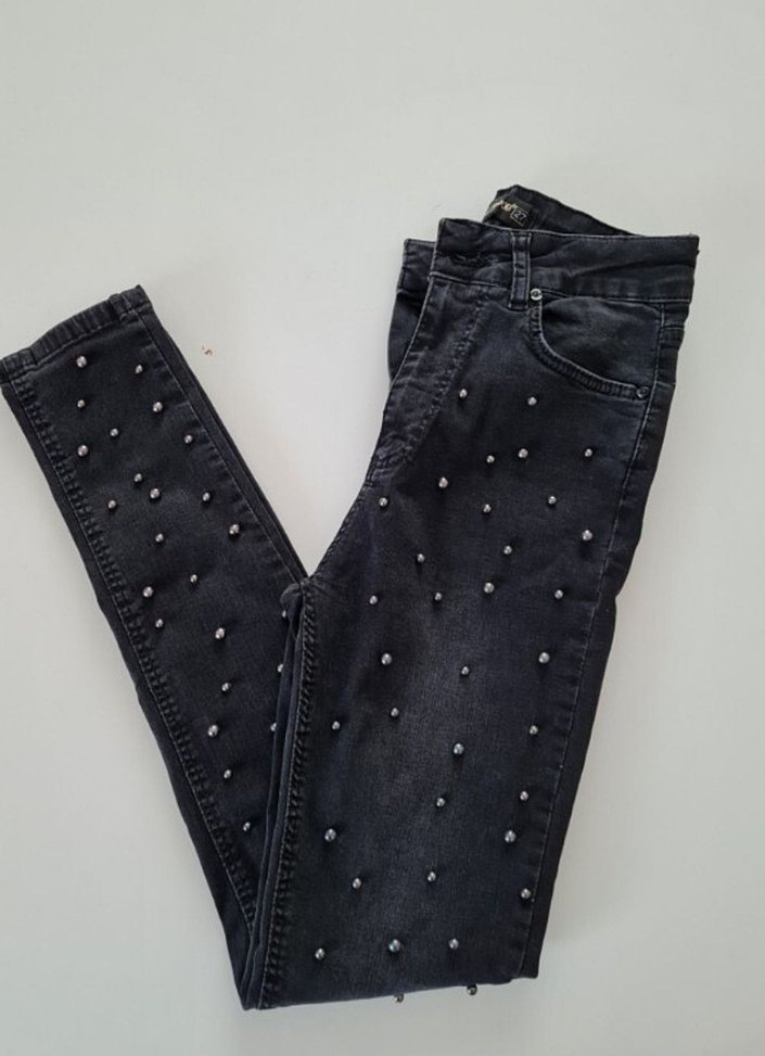 Siyah denimden yapılmış, payetli nakış detaylarıyla süslenmiş, midi boy, dar kesim kadın pantolon. Sokak stili ve günlük kullanım için uygun. ✨