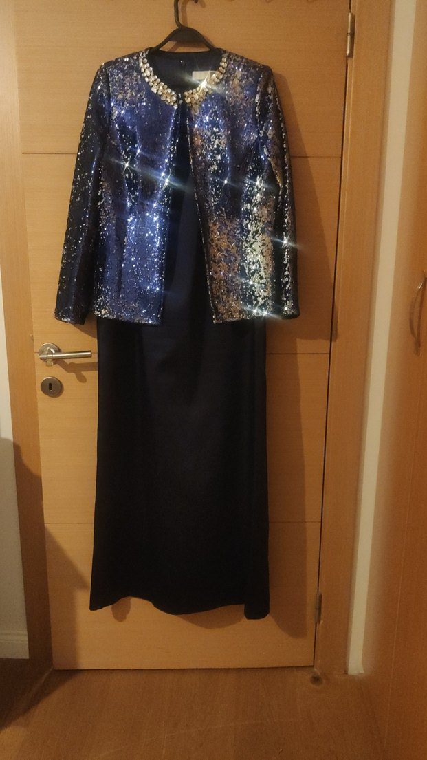 Siyah uzun abiye elbise, regular fit ve uzun kolludur. Payetli ceketle süslenmiş, gösterişli ve avant-garde tarzda, parti için uygundur.