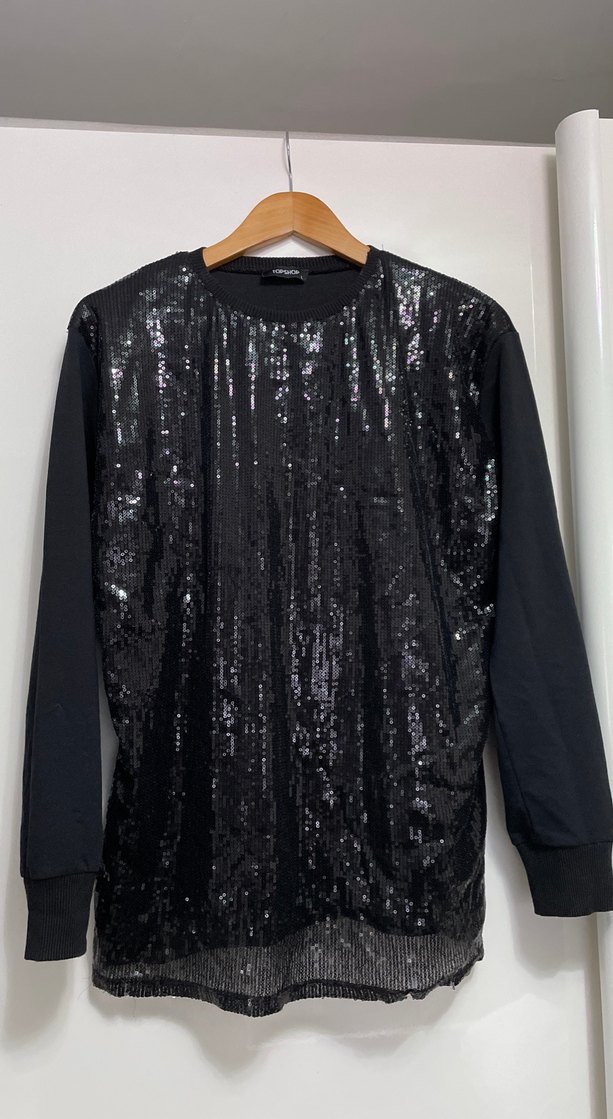 Erkekler için uzun kollu, yuvarlak yaka ve bol kesim siyah payetli sweatshirt. Uzun boyu ve sentetik kumaşıyla günlük sokak stiline uygundur. ✨