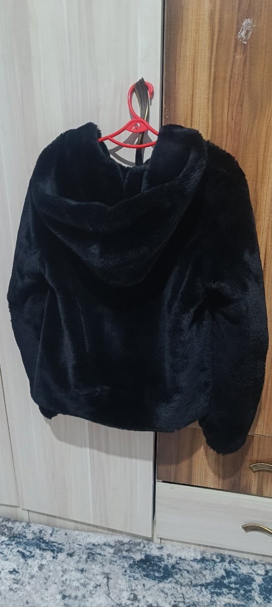 Yumuşak peluş kumaştan yapılmış, siyah renkli, yüksek yakalı ve kapüşonlu fermuarlı uzun kollu kadın montu. Rahat kesimi ve midi boyu ile gündelik kullanıma uygundur.