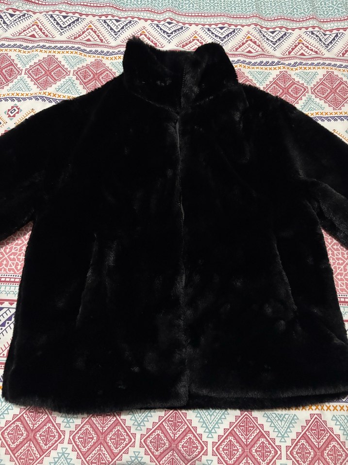 Yumuşak peluş kumaştan yapılmış siyah, yüksek yakalı ve uzun kollu, bol kesim sahte kürk ceket. Sokak stili ve günlük kullanıma uygun.