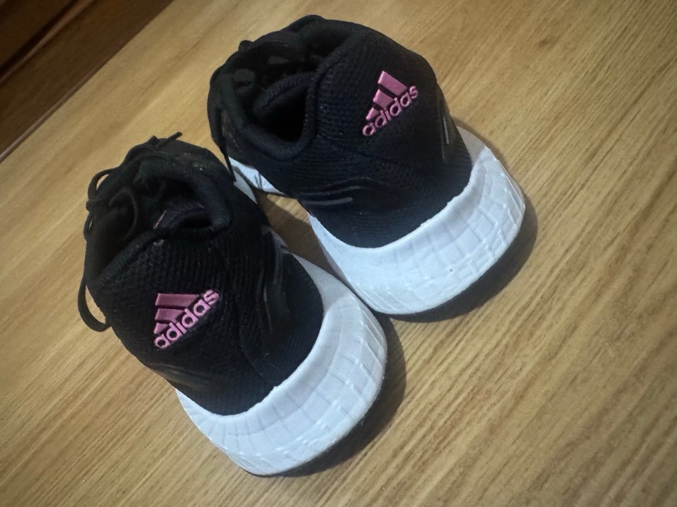 Kadınlar için elastik, düz tabanlı kauçuk spor ayakkabılar. Siyah renkte, pembe adidas logosu ile sokak stili ve spor giyim için uygundur.