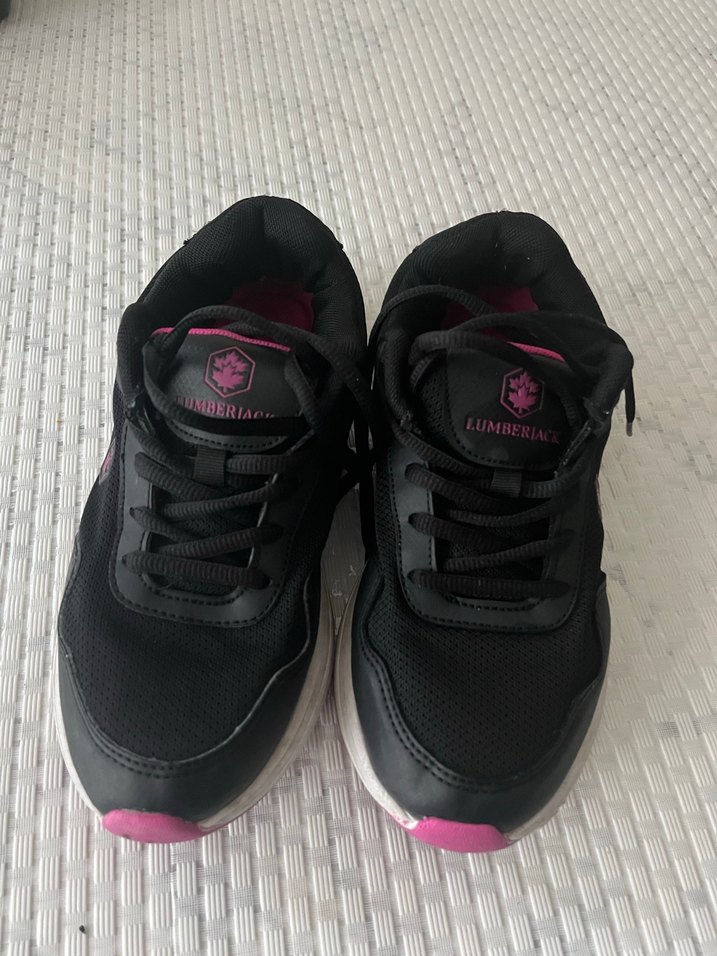 Kız çocukları için koyu pembe ve siyah renklerde, bağcıklı ve kauçuk tabanlı spor ayakkabılar, trend sokak giyimine uygun.