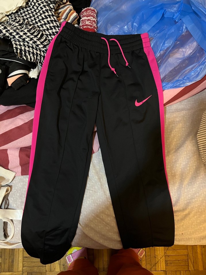 Kadınlar için siyah ve pembe yan şeritli, Nike logolu bol kesim eşofman altı. Rahatlık için lastikli ve bağcıklı bel bandı bulunur. Günlük kullanıma uygundur. Ürün orijinaldir ayrıca.