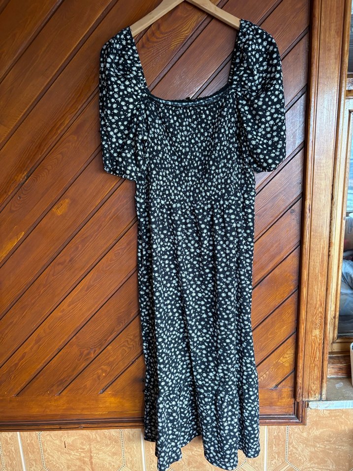 Siyah uzun elbise, bol kesim ve pile detaylıdır. Kısa kollu ve kayık yaka tasarıma sahip olup, hafif batik desenlidir. Bohem ve retro tarzını yansıtır.