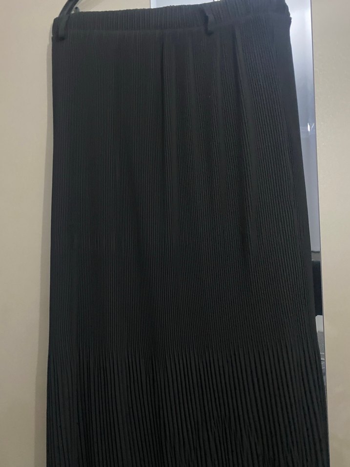 Siyah renkli, sentetik kumaştan yapılmış pileli uzun etek, normal kesim ve minimalist tarzıyla ofis için uygundur.