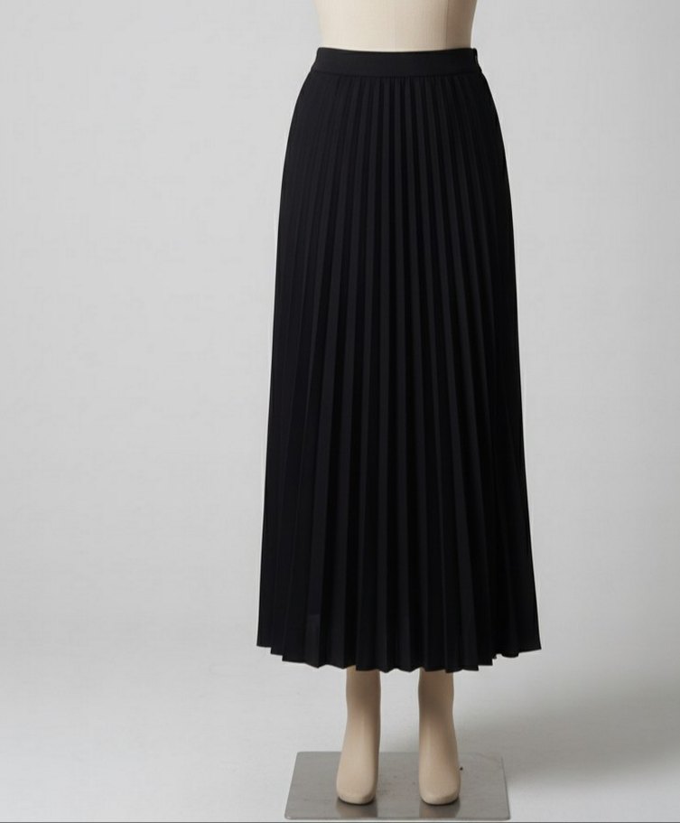 Siyah renkli, pileli ve normal kesim uzun etek. Ofis kullanımı için minimal ve klasik şıklık sunar.