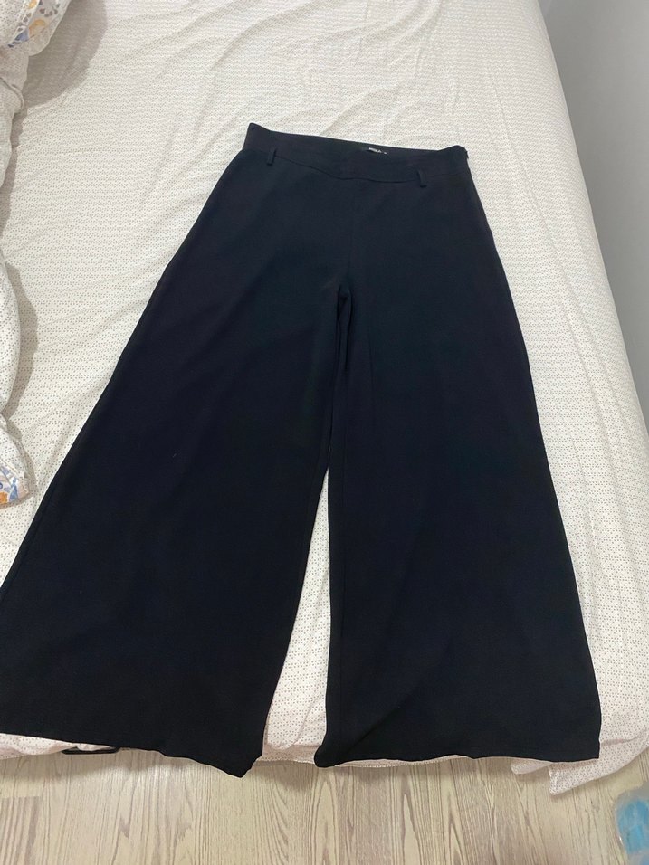 Kadın siyah kumaş pantolon, uzun boy, bol kesim ve pilili detaylara sahiptir. Günlük rahat kullanım için sentetik kumaştan üretilmiştir.