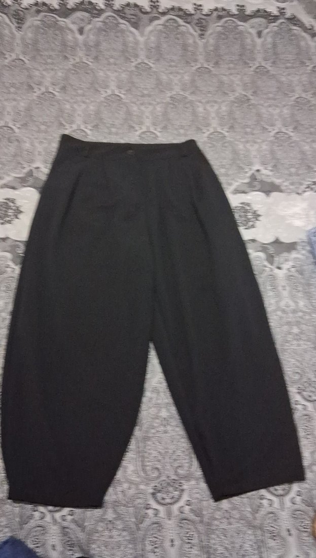 Kadınlar için geniş kesim, pilili siyah kumaş pantolon. Midi boyda, sokak stiline uygun, sentetik kumaştan rahat kullanım sağlar.
