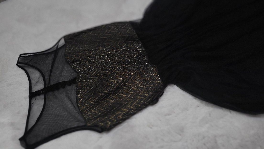 Sentetik kumaştan yapılmış siyah dantelli gotik tarzda karanlık dokulu desenle gece elbisesi . Moda ve avangart görünüm için uygundur.